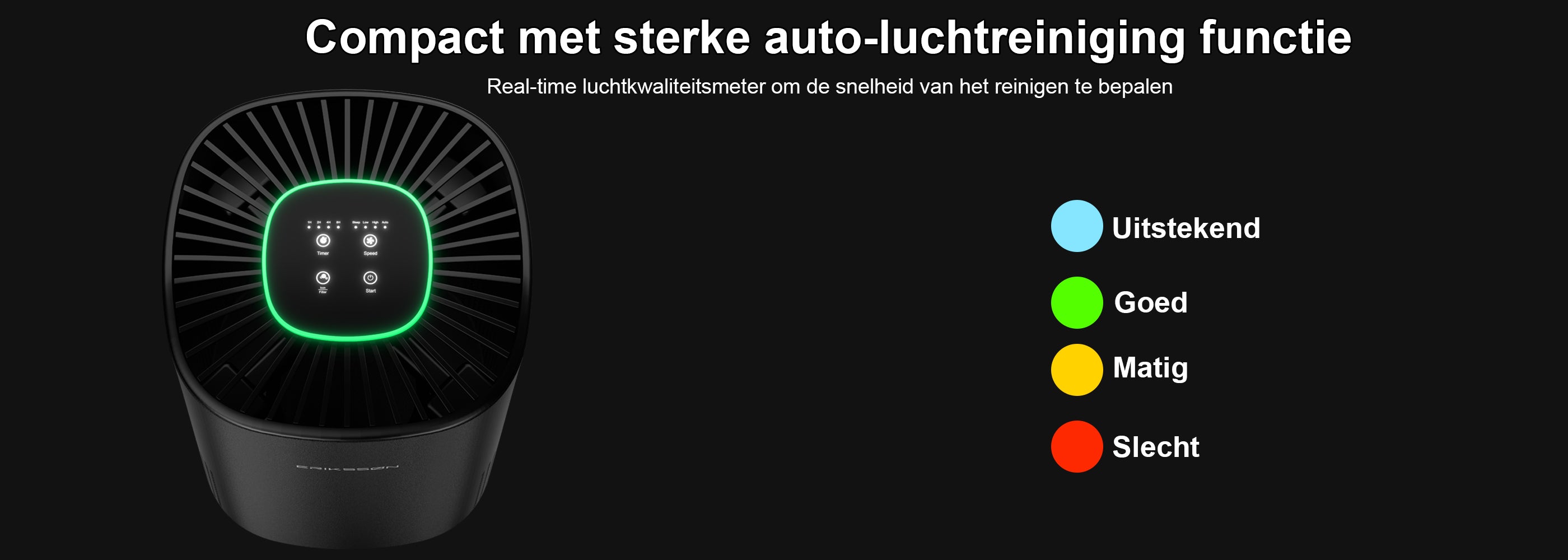 Auto-modus monitort de luchtkwaliteit, past de snelheid van de ventilator aan en zuivert de lucht naar een gezond niveau.