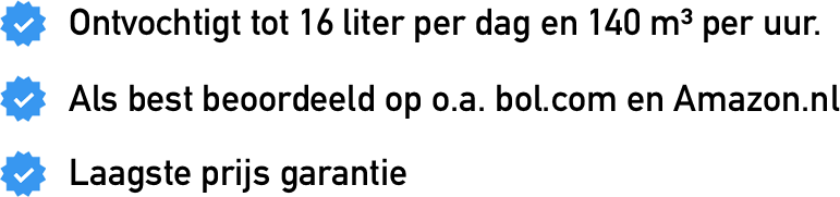 - Ontvochtig tot 16 liter per dag en 140 m³ per uur.
