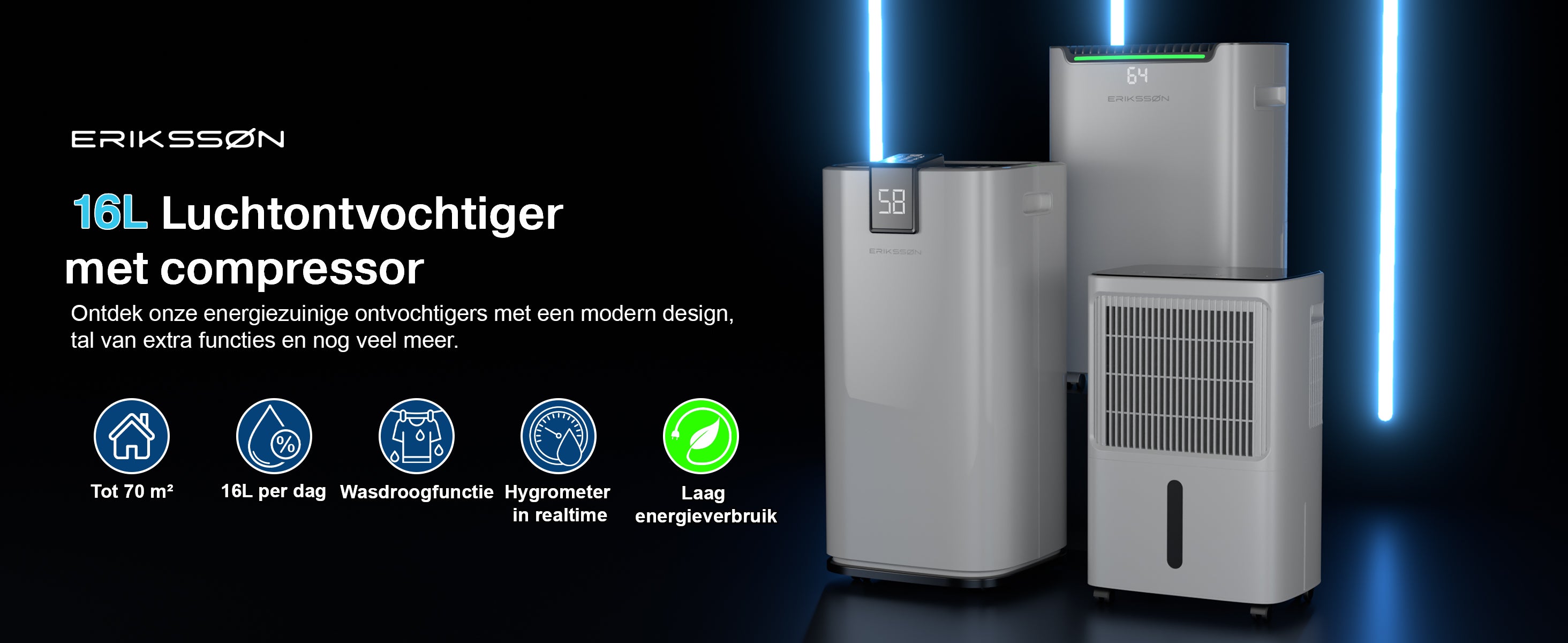 Wil jij vochtproblemen en muffe geurtjes in huis verhelpen, pollen in huis verminderen of simpelweg in het juiste luchtvochtigheidspercentage leven? Dan is de Erikssøn Luchtontvochtiger Dry Pro Plus perfect geschikt voor jou!