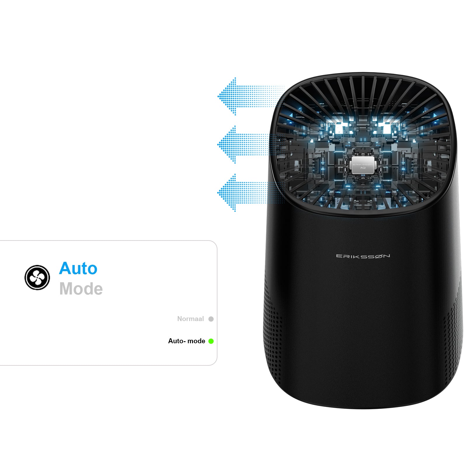 Auto-modus monitort de luchtkwaliteit, past de snelheid van de ventilator aan en zuivert de lucht naar een gezond niveau.